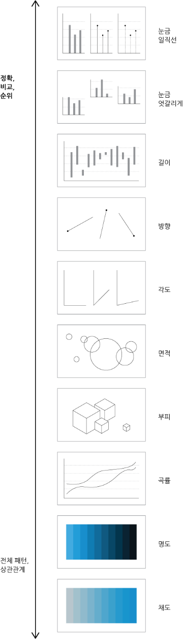 위 그래프에서 위로 갈수록 사람들은 더 정확한 판단을 내리기 쉽습니다. 반대로 아래로 내려 갈수록 정확한 비교나 순위 결정보다는 총괄적인 패턴이나 각 변인과 지리적 위치 간의 관계를 파악하기 쉽습니다. 이에 따라 정보디자인의 목적에 따라 디자이너는 적절한 그래픽 유형을 선택할 수 있습니다. 정확한 정보를 이해시키기 위함이라면 꺾은선, 막대, 파이 그래프 등으로 표현하는 것이 좋습니다. 반면 전반적인 상황이나 관계를 이해시키기 위함이라면 히트맵 등을 활용하는 것이 좋습니다.
