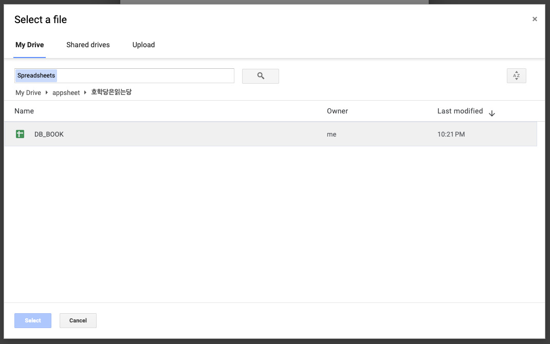 마지막으로 기존에 만들어 놓은 DB인 스프레드시트를 찾아 클릭하면,
