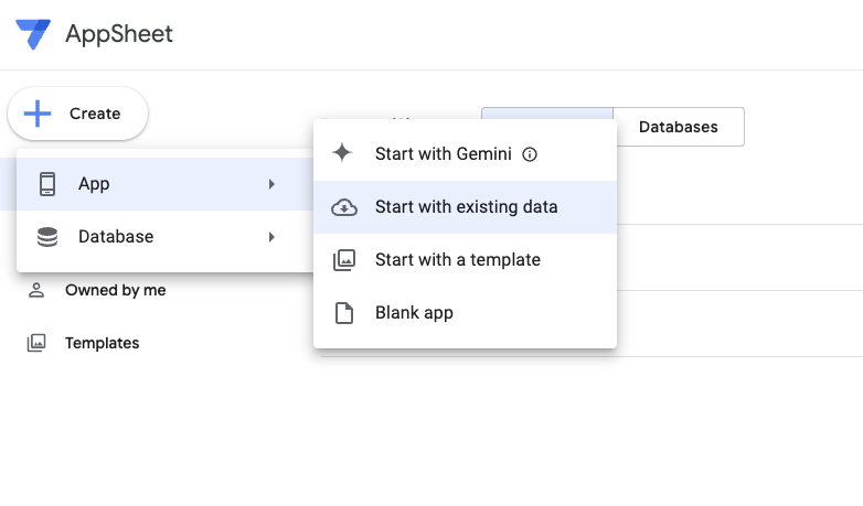 Create 버튼을 클릭하고 >> App > Start with existing data 클릭하시면,