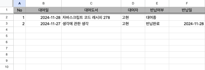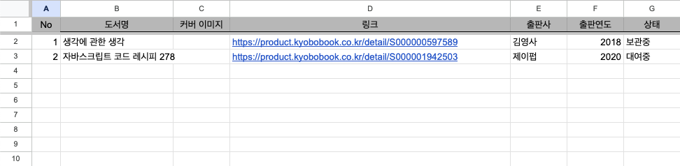 그리고 스프레드시트를 켜고 우리가 만들 '도서 대여 앱'에 필요한 정보들을 정리하면 준비 작업은 끝입니다.