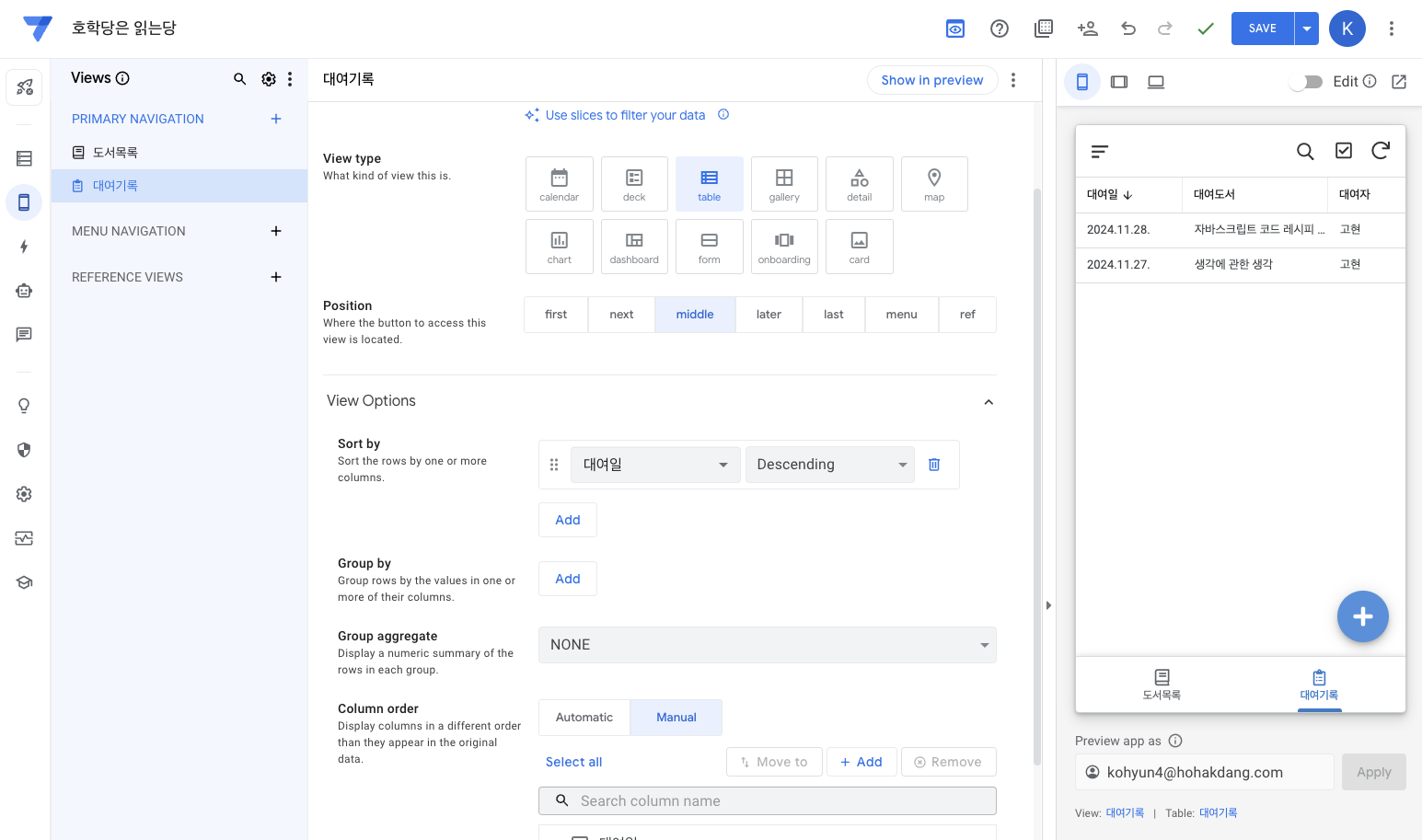 같은 스프레드시트 안에 있으므로 앱시트에서 [대여기록] 시트를 자동으로 추천해주고 있습니다.