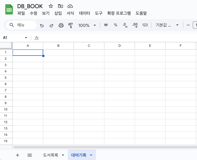 그 폴더 안에 적당한 이름의 스프레드시트(예. DB_BOOK)를 생성해주세요.