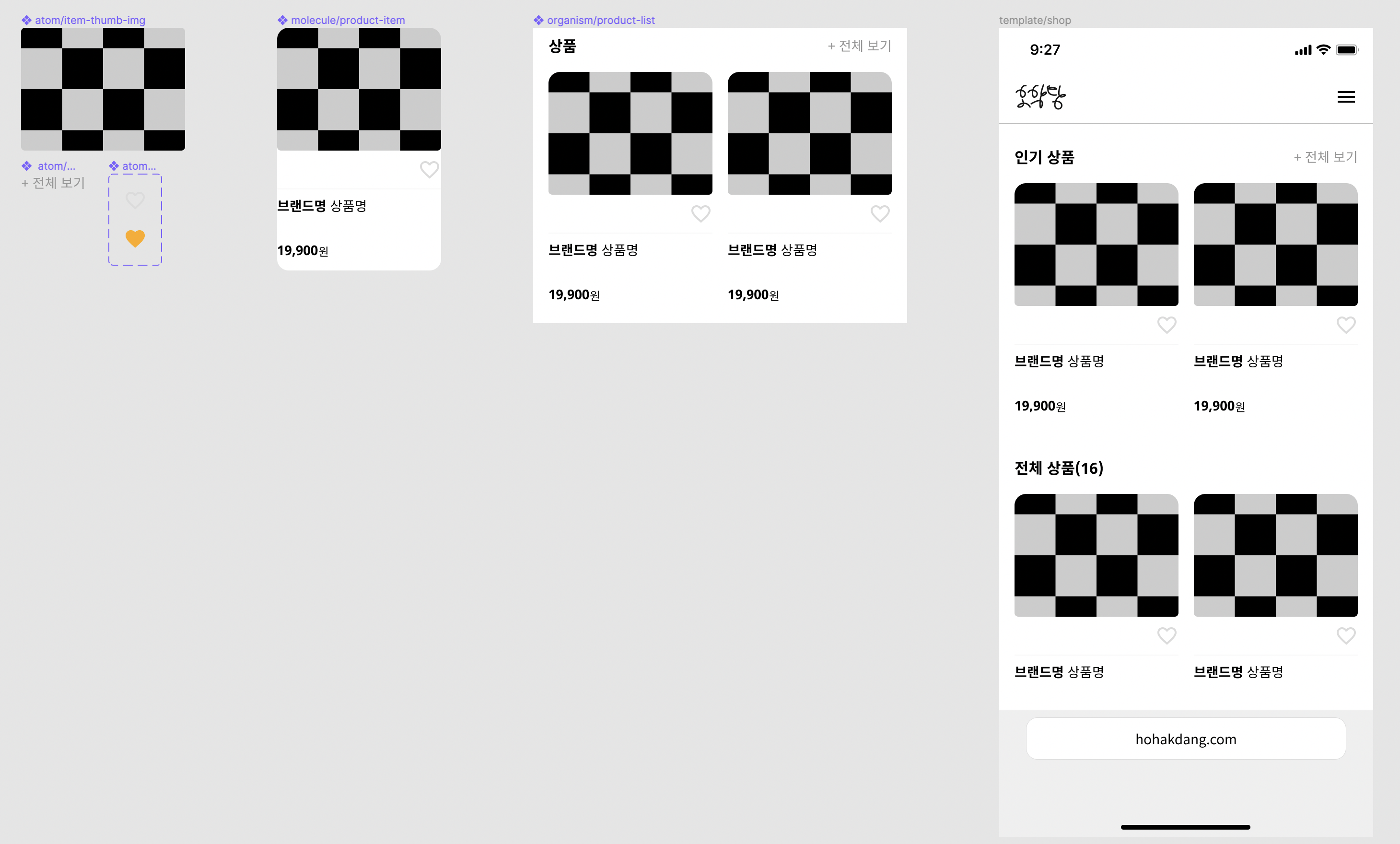 오른쪽의 디자인 시안은 Atomic Design Pattern을 참고하여 컴포넌트를 정리한 디자인 시안입니다.