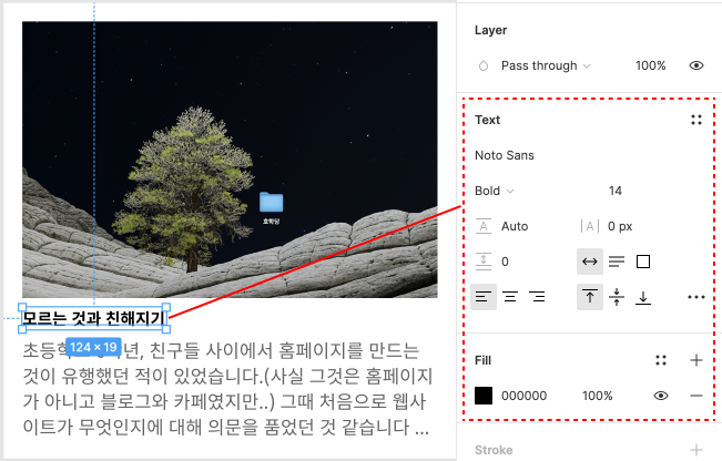 각 콘텐츠는 스스로 스타일(Noto Sans, 14pt, Bold, #000000, ...)을 갖고 있습니다.