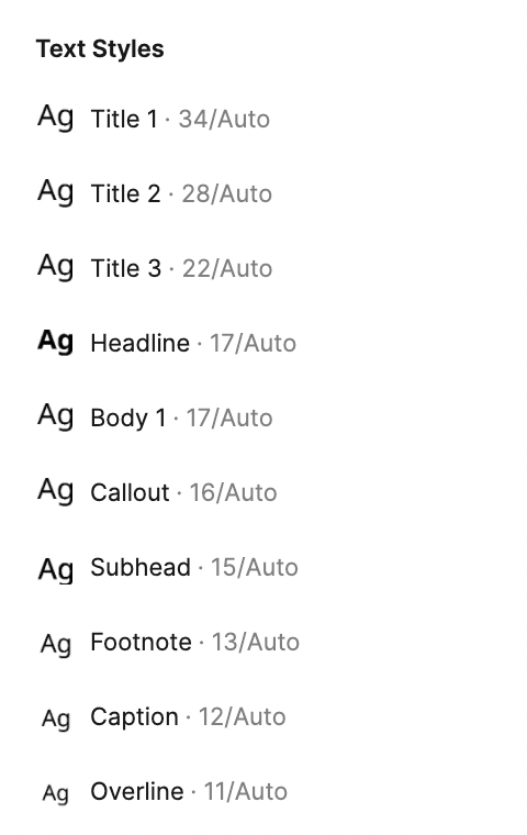 UI 컴포넌트에 텍스트가 포함된 경우 각 텍스트마다 서체의 크기, 두께 등을 설정할 수도 있지만 디자인의 양이 많아질수록 버튼 텍스트에 사용된 크기가 15pt였는지 16pt였는지 또는 SemiBold였는지 Bold였는지 헷갈리기 쉽습니다. 마찬가지로 설명하는 본문 텍스트의 색상이 #F5F5F5였는지 #EEEEEE였는지도 헷갈리기 쉽습니다. 이러한 상황은 작업의 속도에 악영향을 미칠 뿐만 아니라 완성된 디자인 시안 내 UI 일관성을 신뢰하기도 어렵습니다. 또한, 전체적으로 글꼴이나 색상을 수정해야 하는 경우를 생각해보면 상당히 비효율적인 업무를 진행해야만 한다는 것을 생각할 수 있습니다.