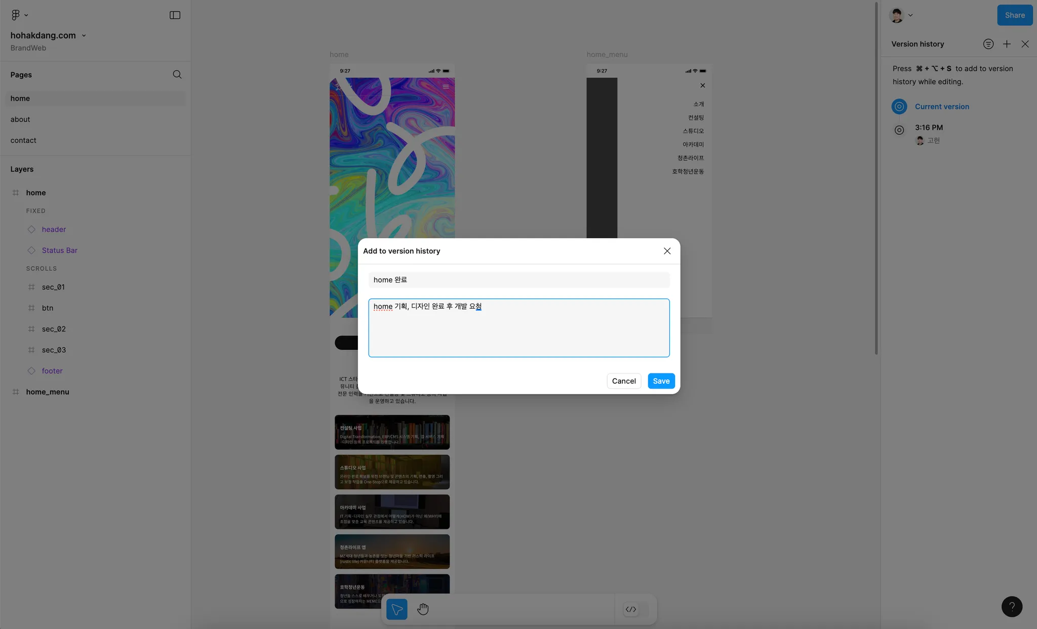 또한, 서비스의 가장 낮은 버전 업데이트인 패치의 경우 별도의 페이지를 만들거나 하지않고, 페이지 내에서 바로 수정을 진행하되 Figma에서 제공하는 Version History(아래 내용 참고)를 활용하여 관리하는 것이 좋습니다.