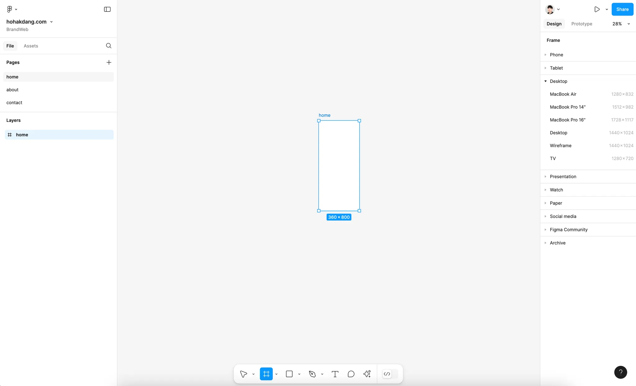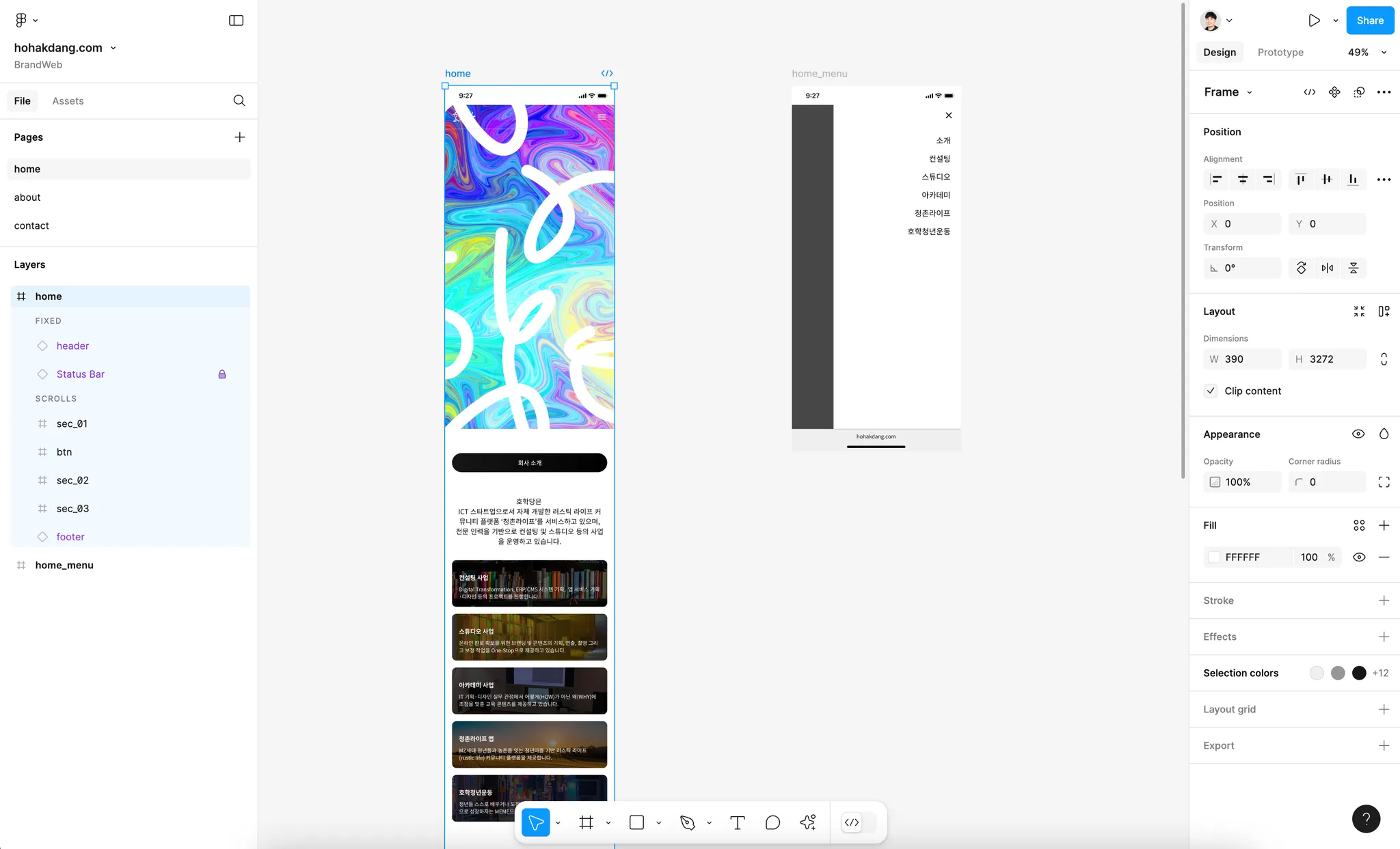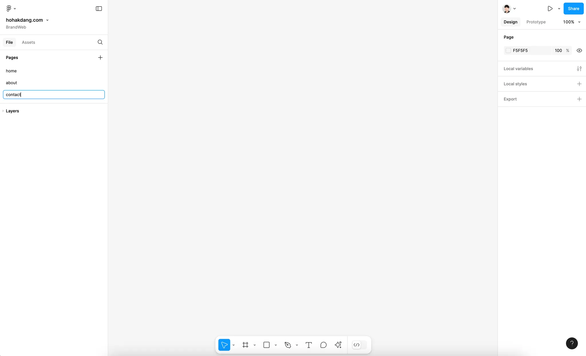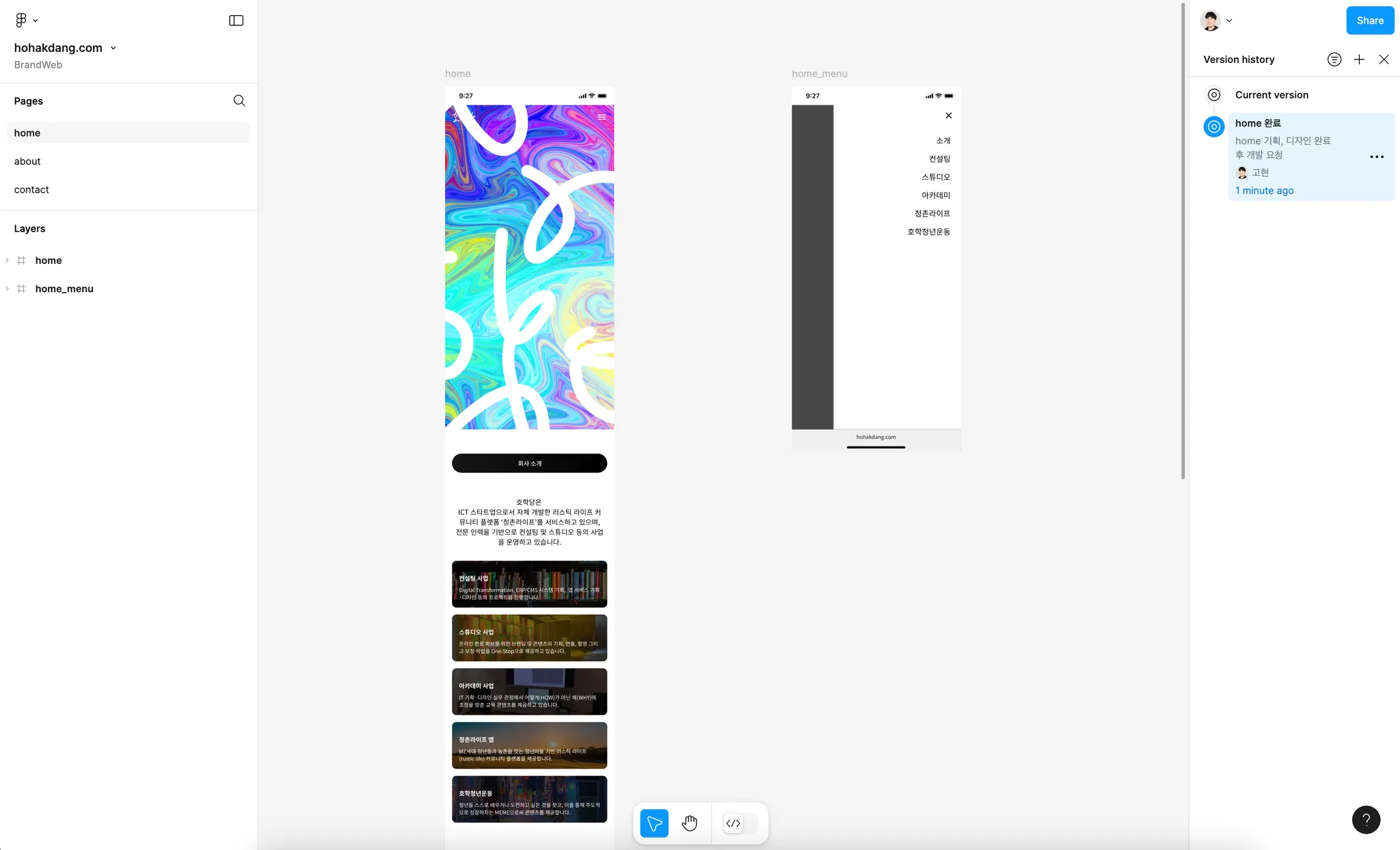 이번 예시에서 호학당은 ‘BrandWeb/hohakdang.com’ 내에 [home, about, contact]으로 페이지를 구성했습니다.