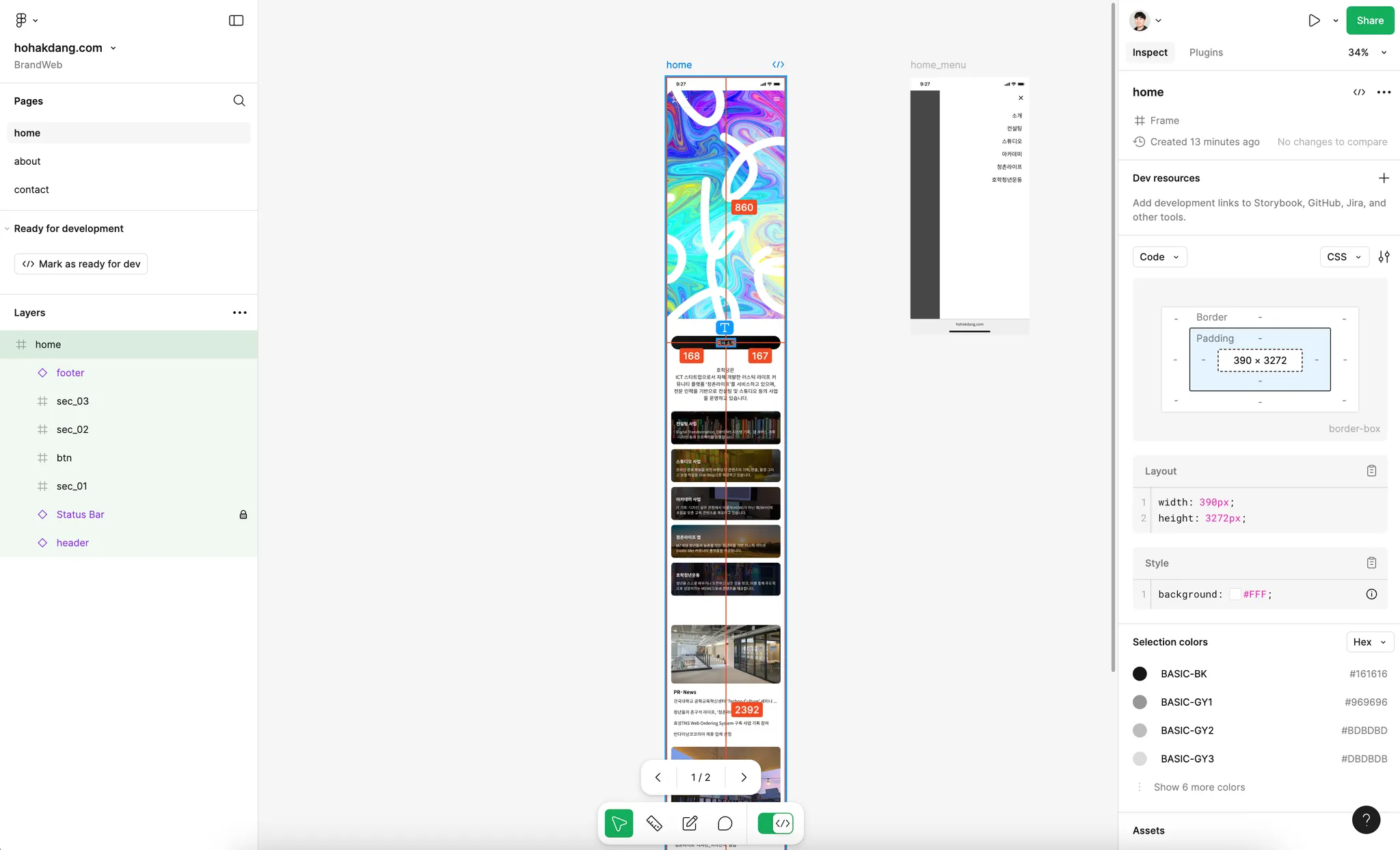 기획팀 및 디자인팀에서는 Figma를 통해 업무를 진행하고 면밀하게 협업하게 되지만, 퍼블리싱팀이나 개발팀(프론트엔드 기준)에서는 실제 디자인된 결과를 보고 UI를 개발해야 합니다. 이를 위해서는 해당 UI의 위치, 크기 등 다양한 스타일 및 제한 조건을 확인해야 합니다(물론 디자인팀에서 이에 맞춰 제대로 UI 디자인 작업을 진행해야겠지만).