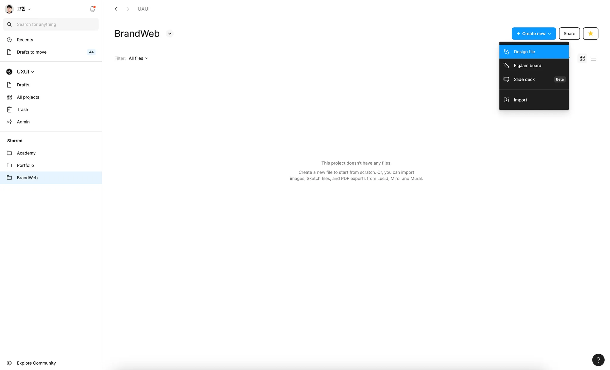 이번 예시에서 호학당의 경우 'UXUI'라는 팀 내에서 호학당 자체 브랜드 웹을 만드는 프로젝트를 진행한다고 가정하고, 'BrandWeb'이라는 프로젝트를 만들었습니다.