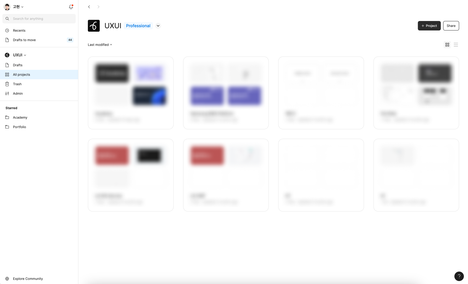 위 예시 이미지에서 호학당은 'UXUI'라는 팀을 생성하여 여러 프로젝트의 기획/디자인을 진행하고 있습니다.